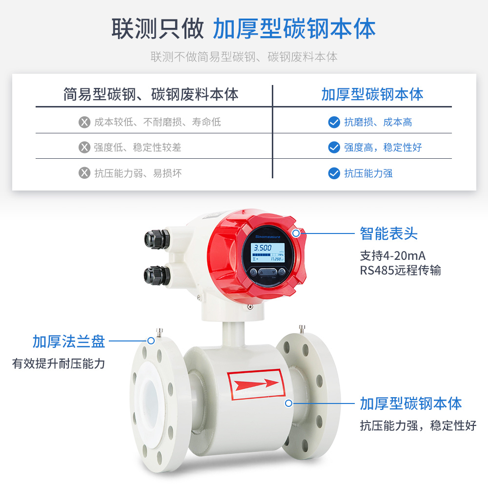 聯(lián)測儀表LDG-SIN大口徑電磁流量計適用于污水、自來水等簡單介質(zhì)或?qū)y量穩(wěn)定性要求不高的場合,可配485通訊功能,目前配置有電極:316L,襯里:氯丁橡膠與聚四氟乙烯等。