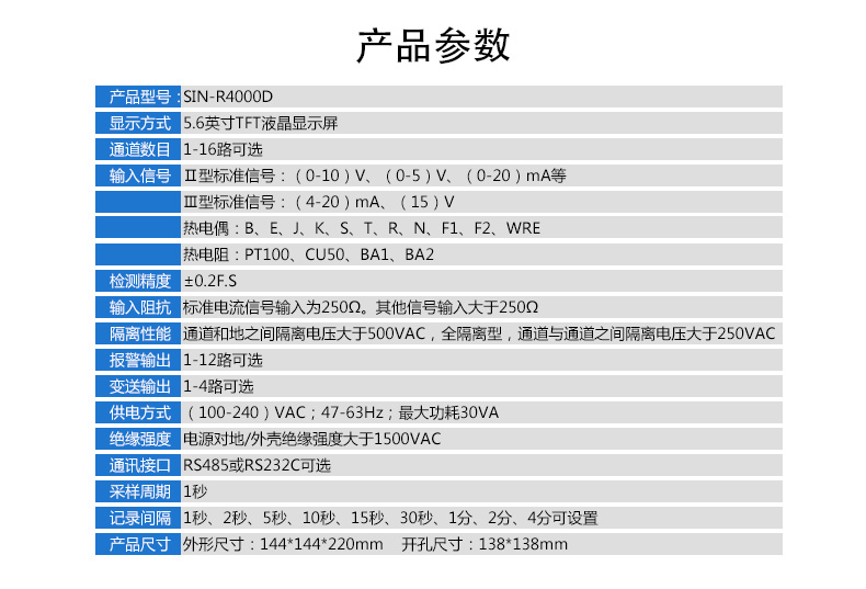 SIN-R4000D系列無紙記錄儀是一種高速高性能微處理器和5.6英寸單色液晶顯示屏,對(duì)現(xiàn)場各種溫度、壓力、流量、電量等信號(hào)實(shí)現(xiàn)監(jiān)測、控制和記錄功能。 SIN-R4000D系列無紙記錄儀可自由組態(tài)輸入標(biāo)準(zhǔn)電流、標(biāo)準(zhǔn)電壓、熱電偶、熱電阻、頻率等信號(hào),可實(shí)現(xiàn)為傳感器配電和繼電器報(bào)警輸出,并且可通過U盤或通訊方式與上位機(jī)進(jìn)行數(shù)據(jù)交換。