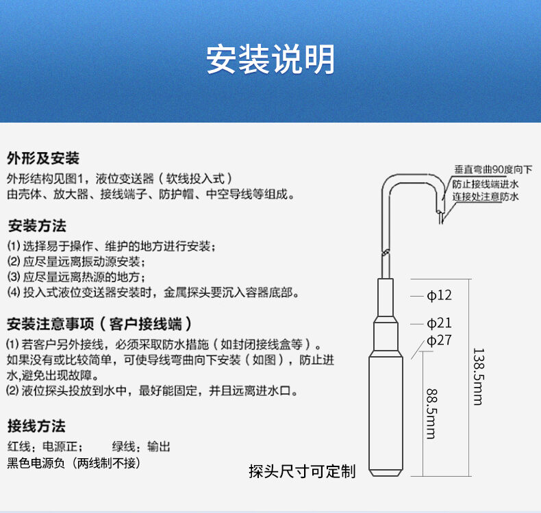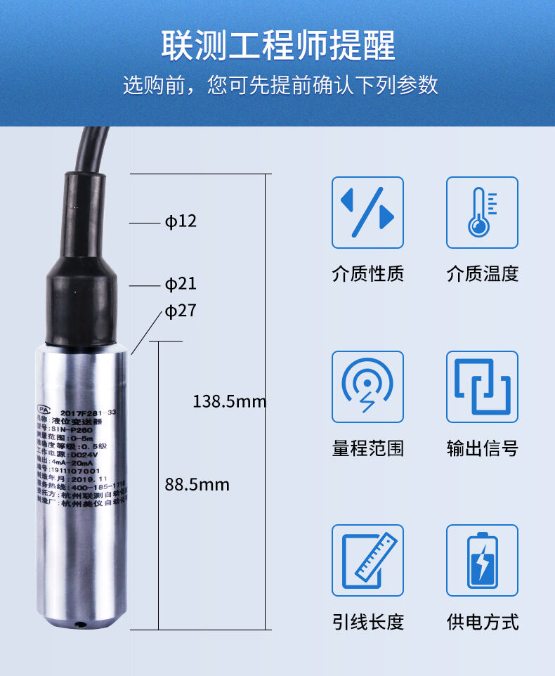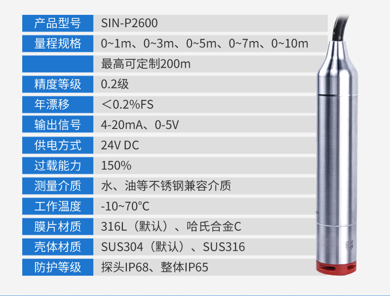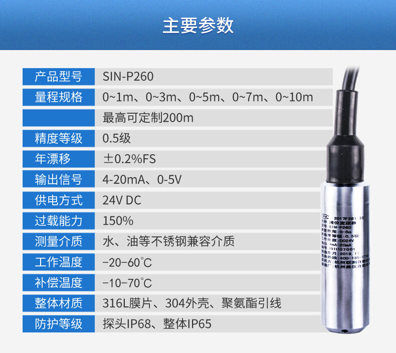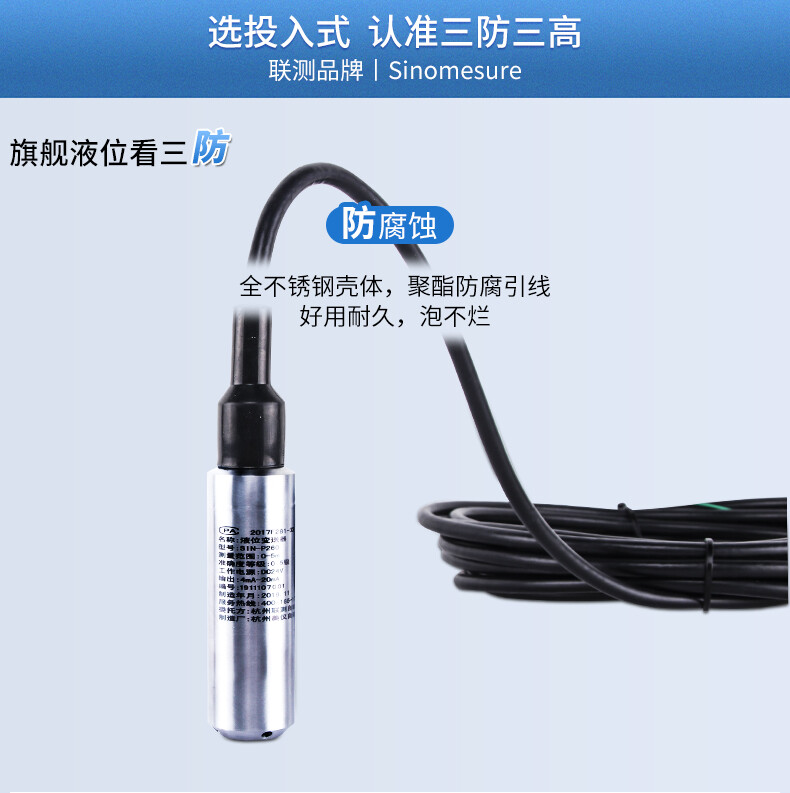 聯(lián)測SIN-P260投入式液位變送器由高性能擴散硅壓阻式壓力傳感器作為測量元件,把與液位深度成正比的液體靜壓力準(zhǔn)確測量出來,并經(jīng)過信號調(diào)理電路轉(zhuǎn)換成標(biāo)準(zhǔn)(電流或電壓)信號輸出,建立起輸出信號與液體深度的線性對應(yīng)關(guān)系,實現(xiàn)對液體深度的測量。